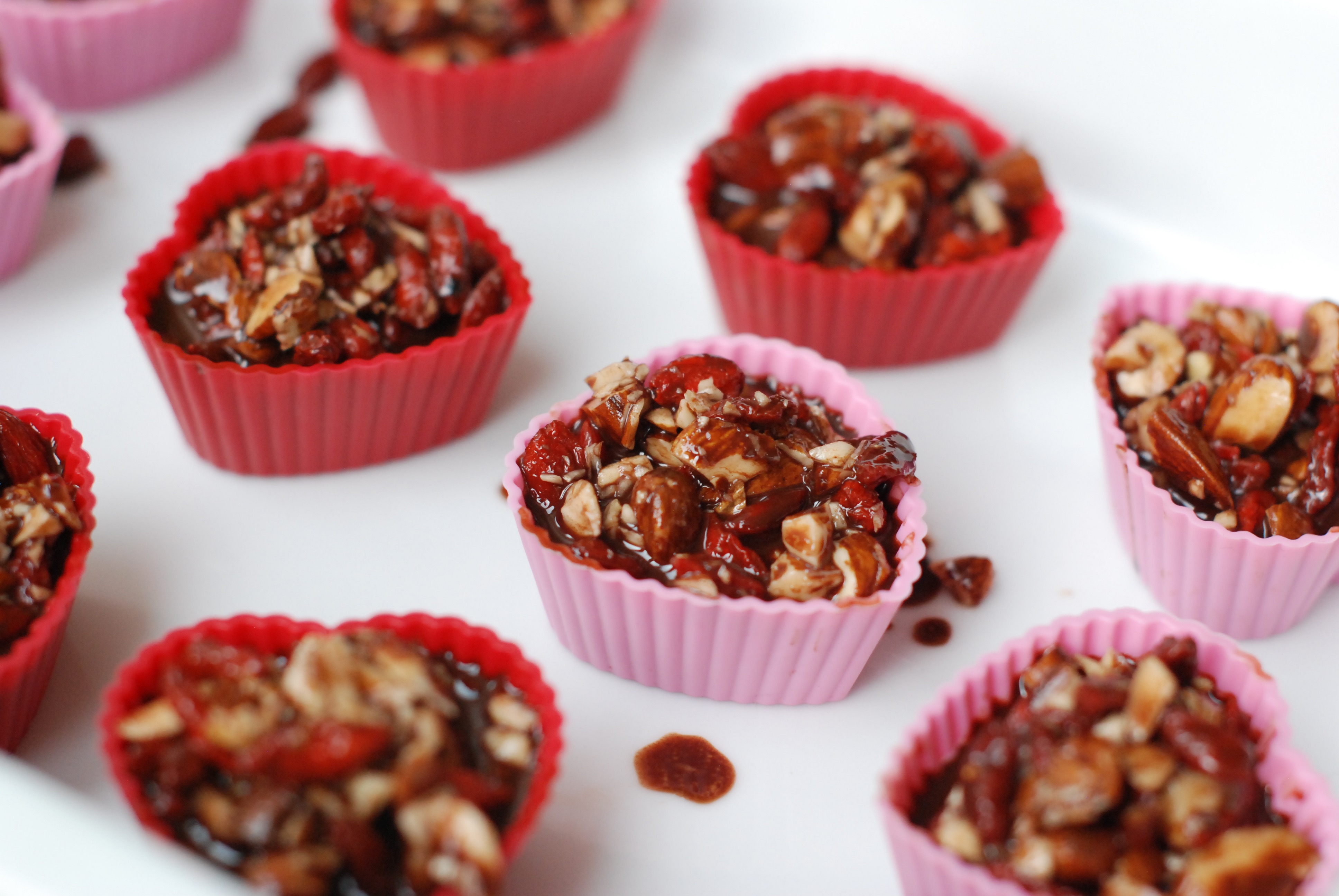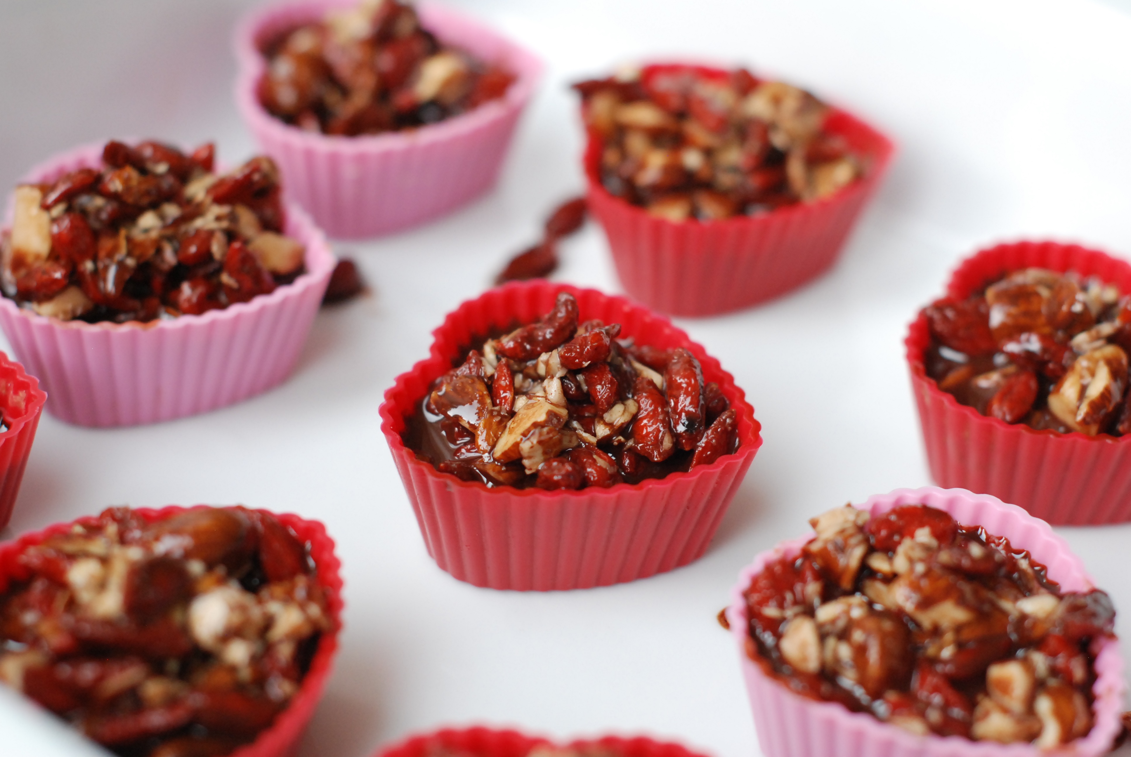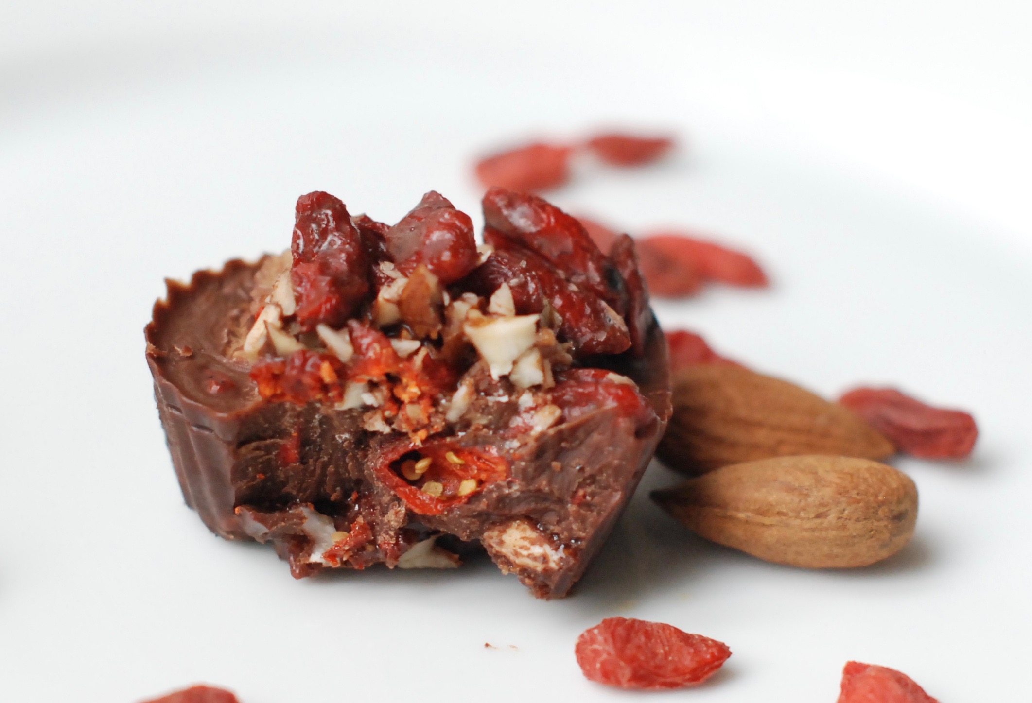 Kombinasjonen av smakene satt sammen er fantastisk god. Sjokoladen er myk, gojibærene er seige, mandlene skaper crunch og havsaltet fremhever smakene. Du kan slenge dette sammen på få minutter!