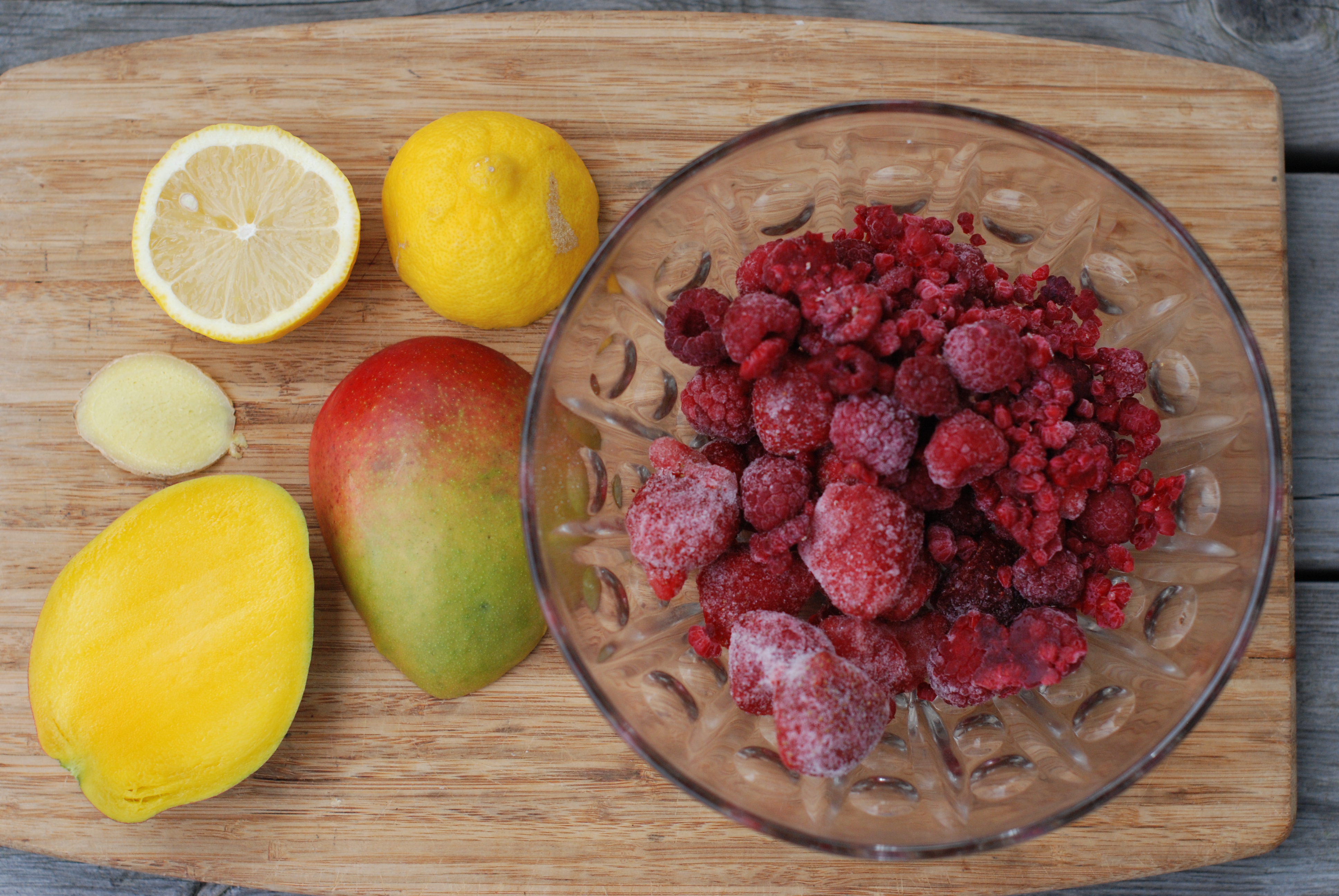 Bringebær- mangosausen er naturlig søt fra mangoen. Sitronen og sitronskallet skaper en god dessertsmak og syrlighet. Dersom ganen trenger litt mer søtning, kan du tilsette et par teskjeer med honning eller noen myke dadler.